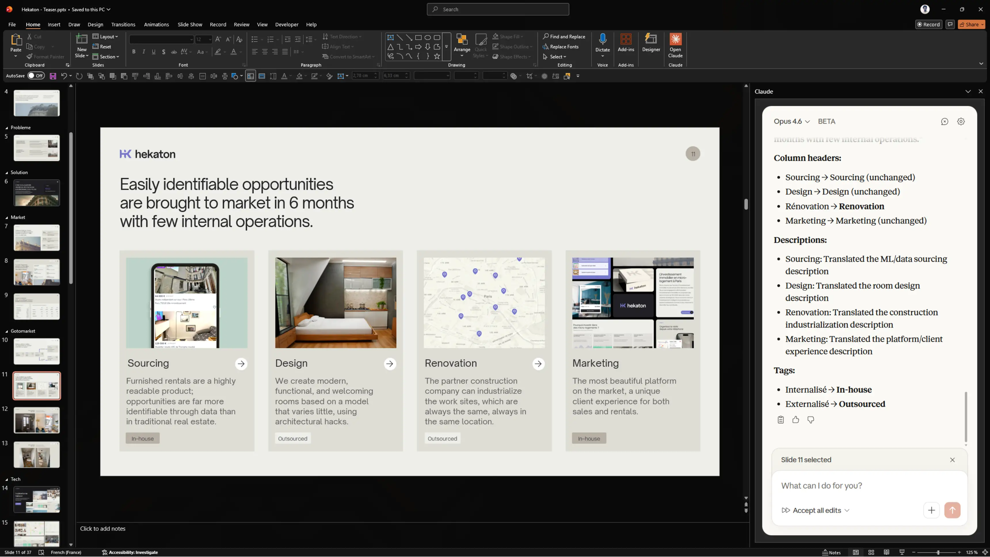 Pourquoi ça marche : Claude lit chaque élément textuel sur l'ensemble du deck, y compris les zones qu'on saute habituellement comme les notes de bas de page et les étiquettes. Le fait de lister les problèmes avant de les corriger vous laisse le temps de valider.