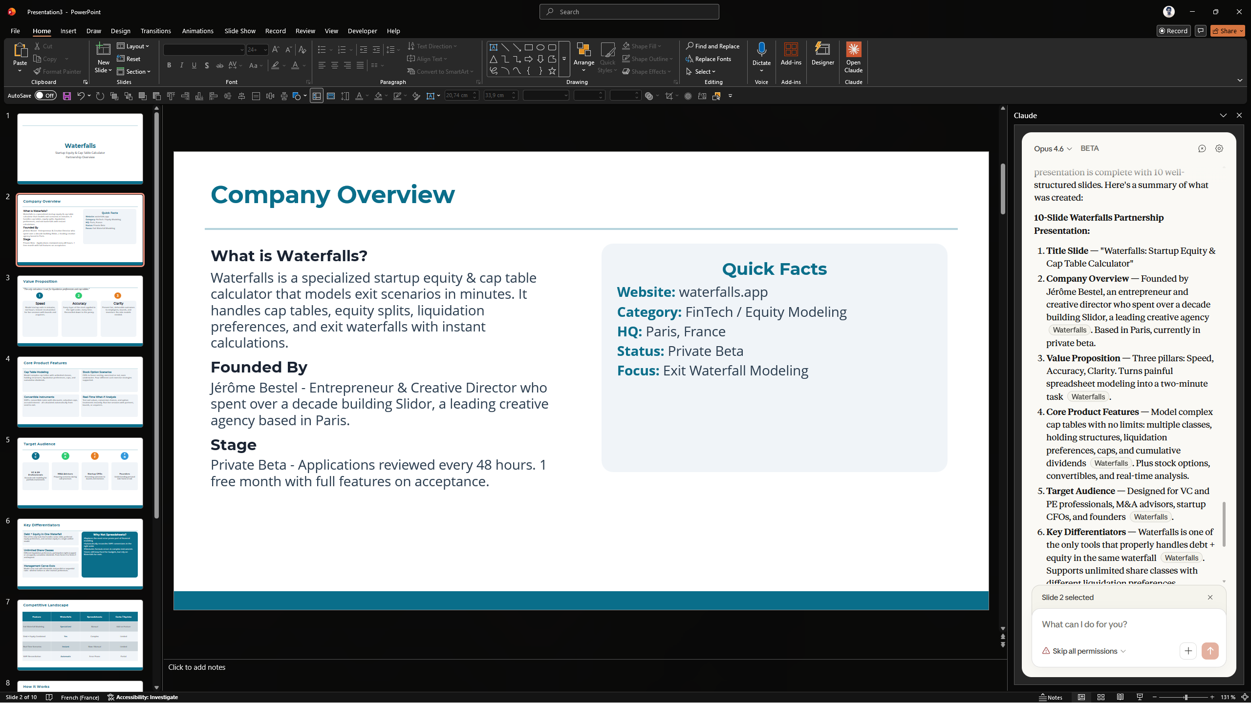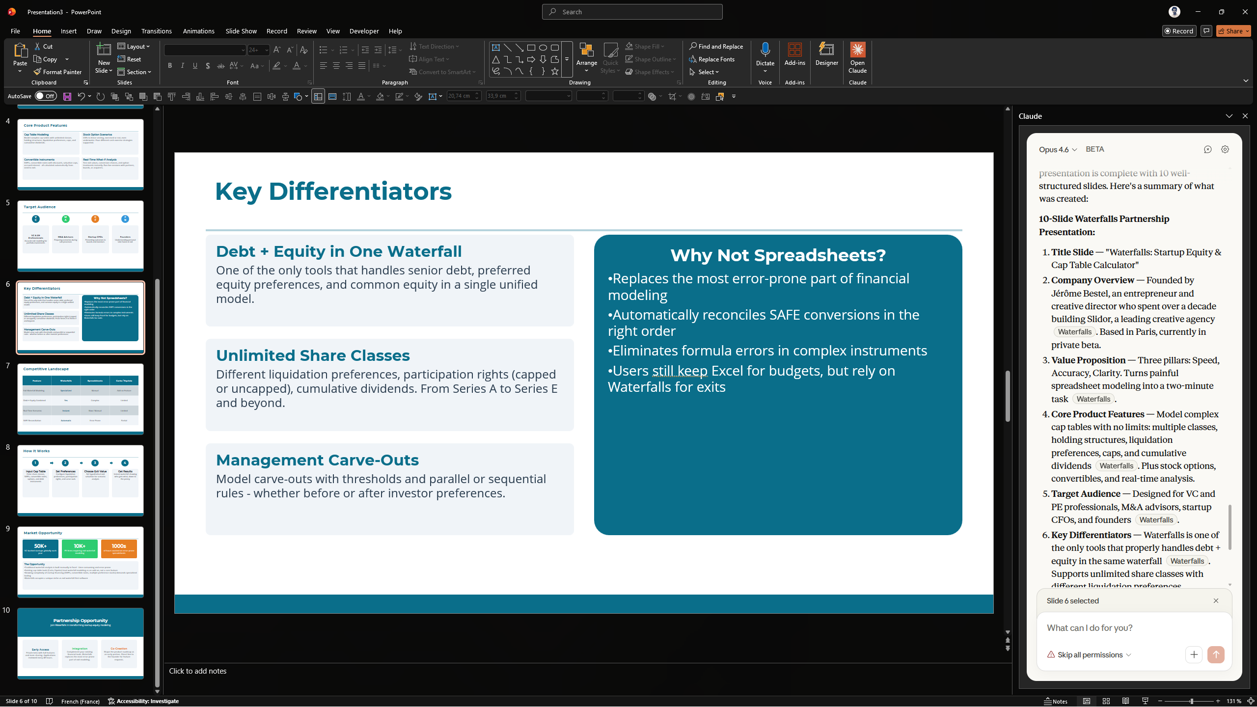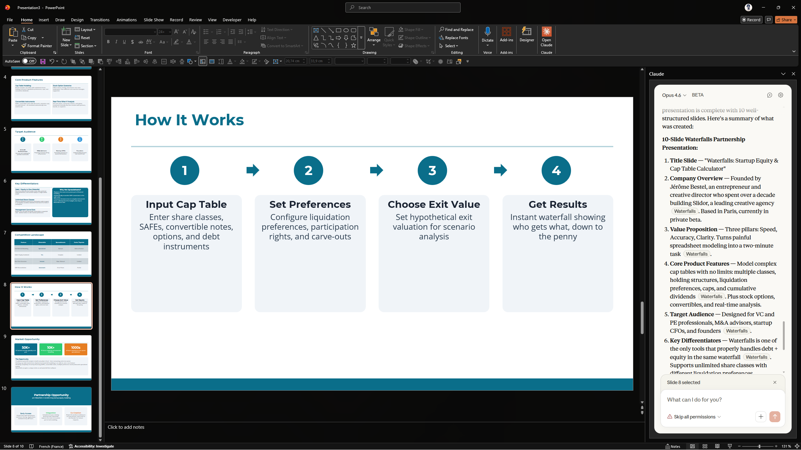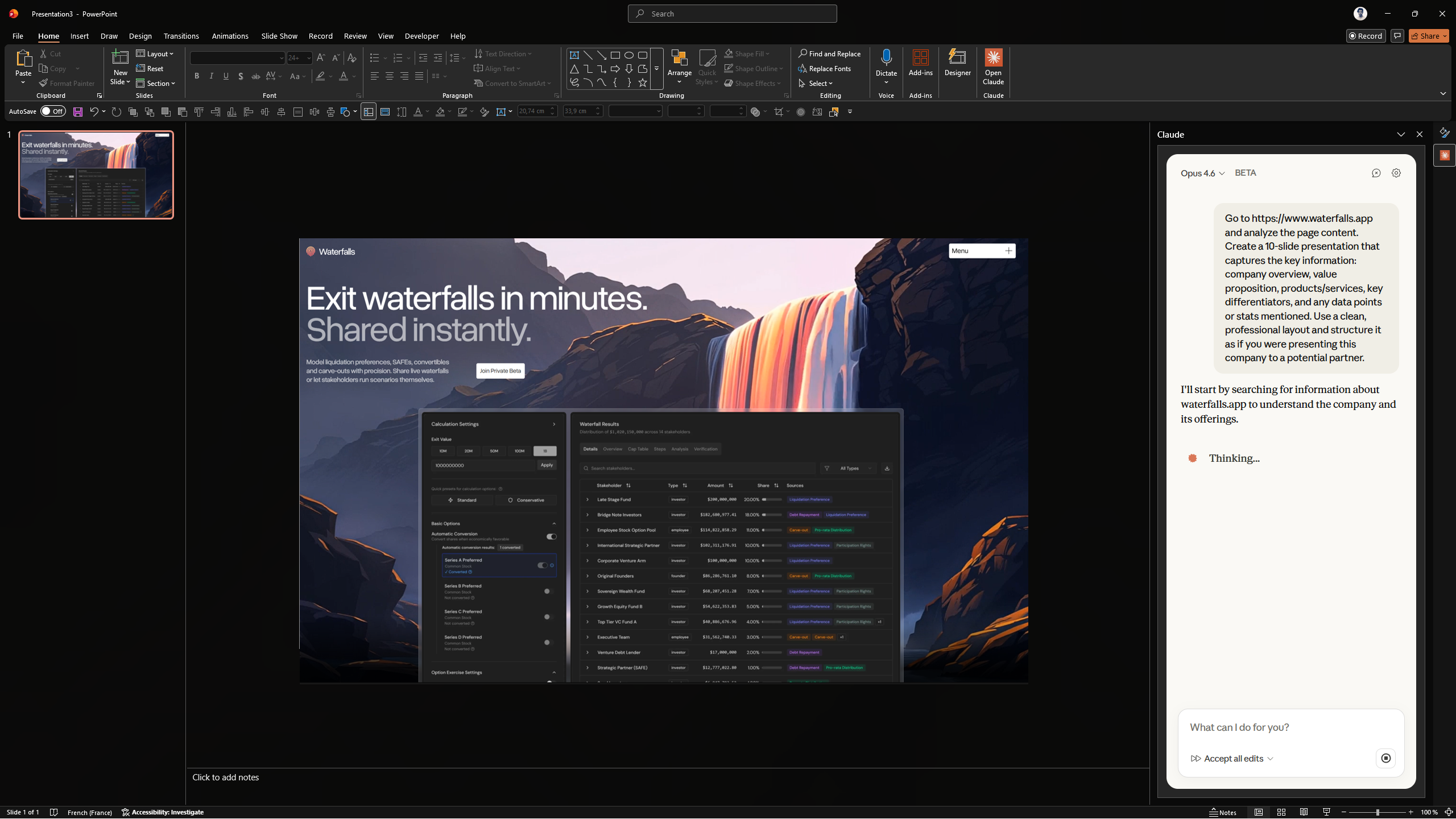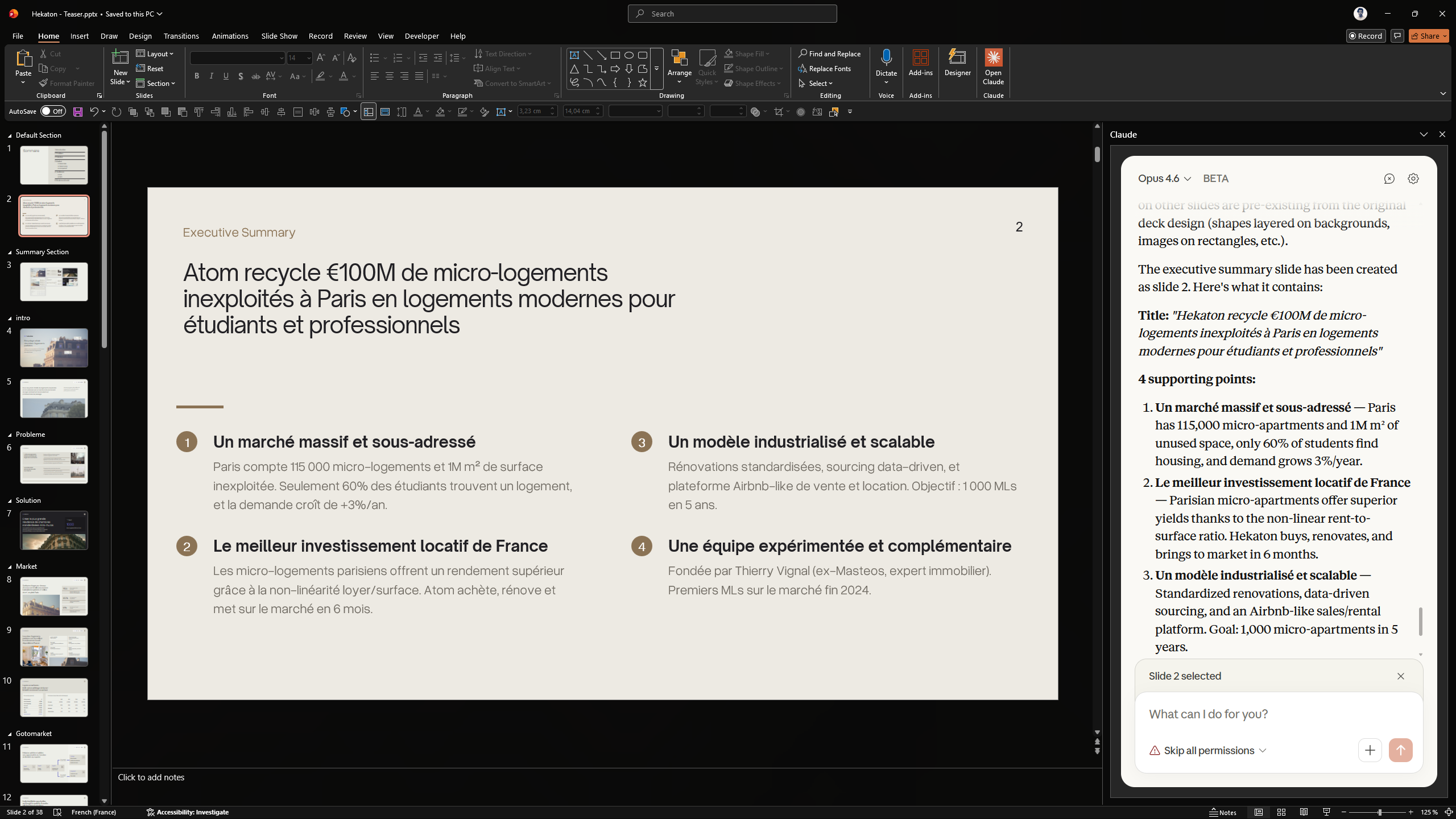 Au lieu de rédiger l'execsum vous-même, laissez Claude lire le deck entier et le condenser en une seule slide. Le design est simple, mais suffisant dans la plupart des cas.